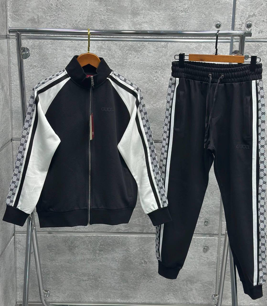 Ανδρικό σετ φόρμας GUCCI σε μαύρο χρώμα με έντονες λευκές contrast λεπτομέρειες και εμβληματικό GG μοτίβο στα μανίκια και στα πλαϊνά του παντελονιού. Ένα κομψό track set που συνδυάζει luxury αισθητική με σύγχρονο sport χαρακτήρα, ιδανικό για premium καθημερινές εμφανίσεις.