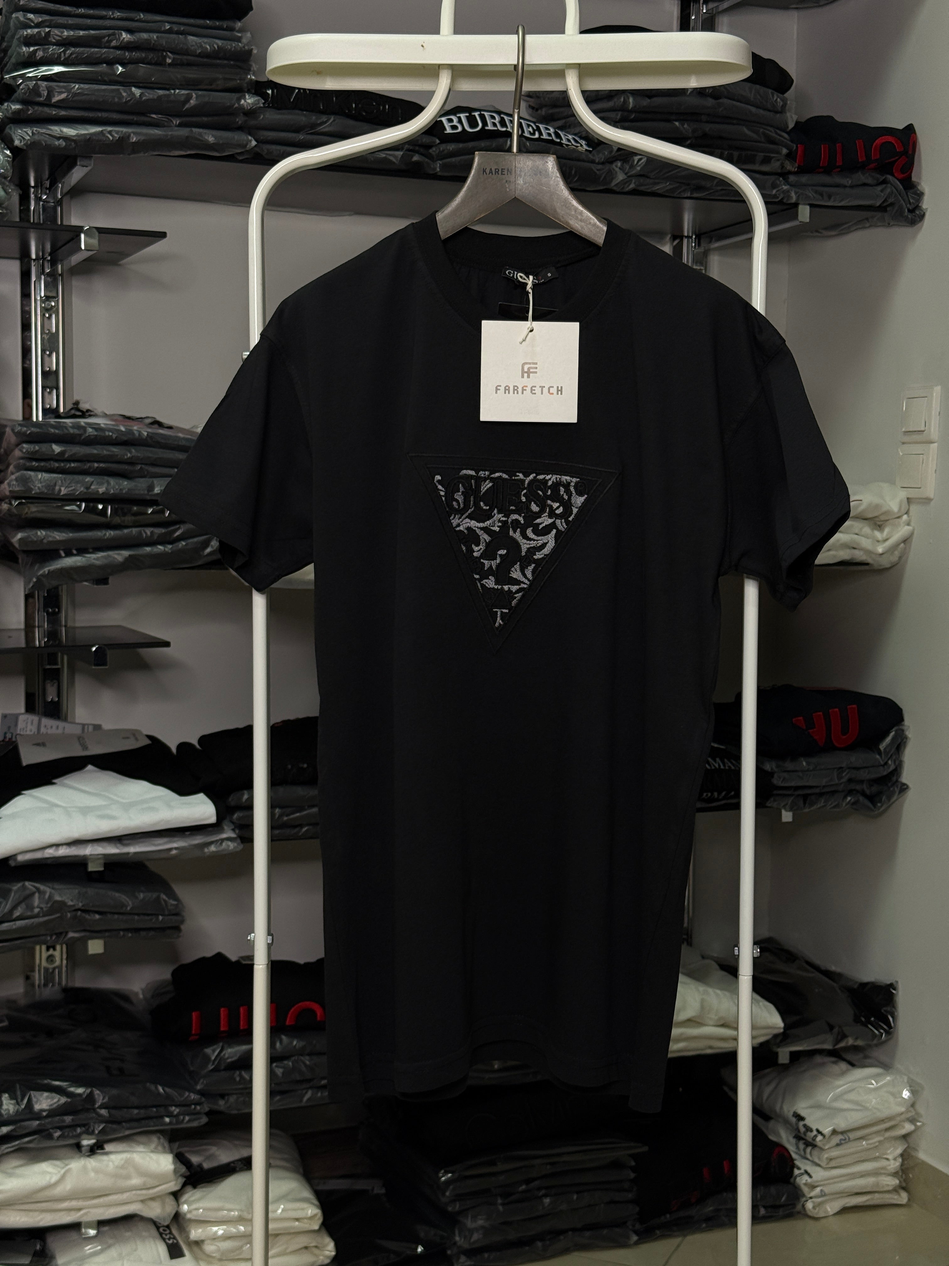 Ανδρικό κοντομάνικο t-shirt σε μαύρο χρώμα με χαρακτηριστικό τριγωνικό logo GUESS στο στήθος. Το κεντρικό σχέδιο συνδυάζει ανάγλυφη υφή και...