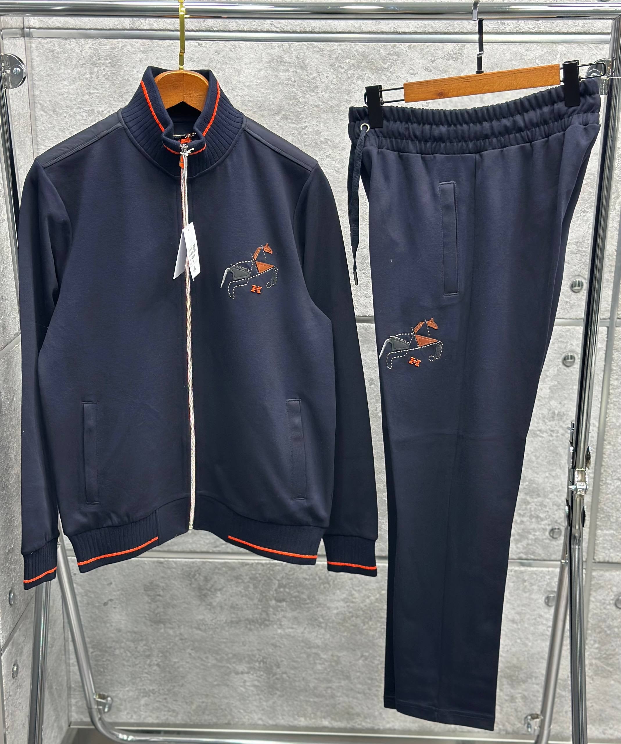 Ανδρικό σετ φόρμας HERMES που συνδυάζει κομψότητα, άνεση και premium αισθητική. Το σετ αποτελείται από μπουφάν με φερμουάρ και παντελόνι φόρμας, σχεδιασμένα για μοντέρνο lifestyle και καθημερινή χρήση με luxury χαρακτήρα.