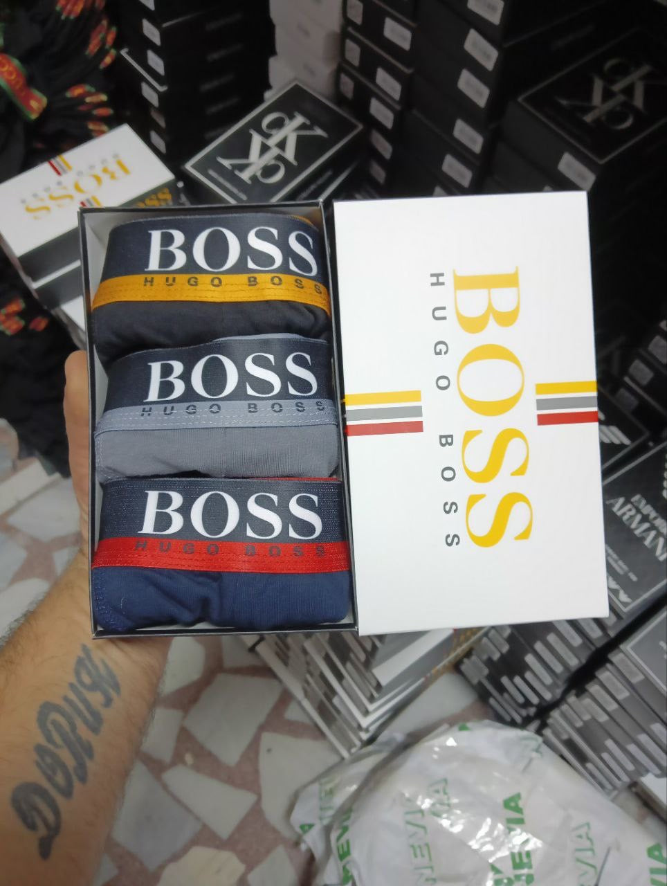 Ανδρικό σετ boxers από τη BOSS Hugo Boss, που περιλαμβάνει 3 τεμάχια σε διαφορετικούς χρωματικούς συνδυασμούς, προσφέροντας άνεση, ποιότητα και διαχρονικό premium στυλ. Κάθε boxer διαθέτει ελαστική μέση με έντονο λογότυπο BOSS, υπογραμμίζοντας τον σύγχρονο και δυναμικό χαρακτήρα του brand.