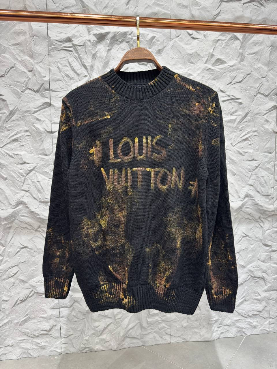 Ανδρικό πλεκτό πουλόβερ LOUIS VUITTON σε μαύρη βάση με ιδιαίτερο abstract washed εφέ σε χρυσούς/μπρονζέ τόνους, που προσδίδει μοναδικό luxury χαρακτήρα. Το iconic LOUIS VUITTON logo στο μπροστινό μέρος λειτουργεί ως statement στοιχείο, αναδεικνύοντας τον σύγχρονο high-fashion σχεδιασμό του brand.